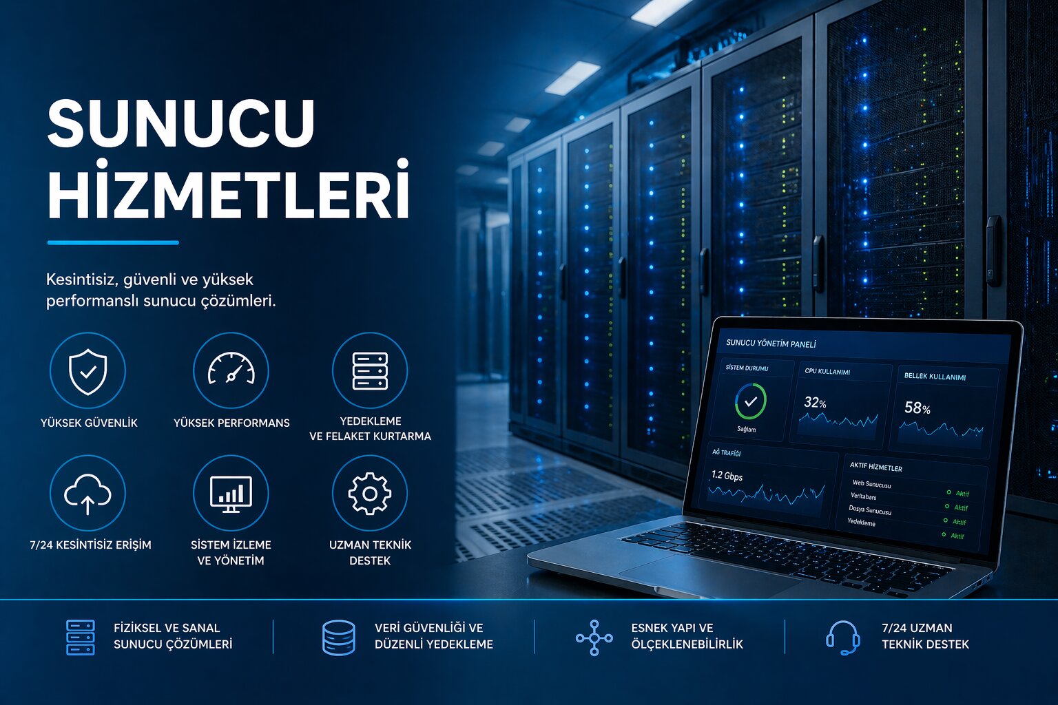 Sunucu hizmetleri kapsamında kurulum, yapılandırma, izleme ve bakım süreçleri profesyonel olarak gerçekleştirilir.